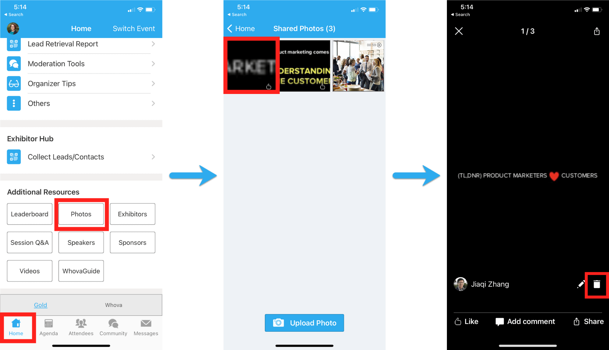 - There, you can view all the photos uploaded to the event. Tap the photo or video you want to remove, and then tap the trash icon in the lower right-hand corner.