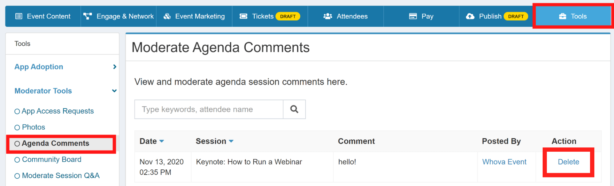- On the left-hand sidebar, choose Moderator Tools, and then Agenda Comments.