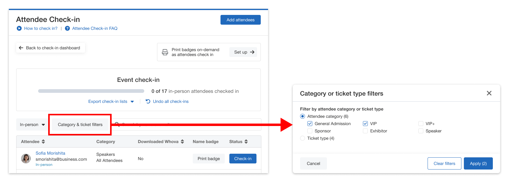 Once there, you can select any attendee categories (for example: exhibitors, speakers, attendees, students, parents, etc) or ticket types you’d like to apply to the filter, then view a more specified list! This filtering system makes the check-in process smoother because you don’t have to go through the entire list of attendees to check individuals in.