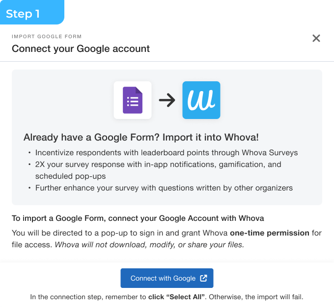 When creating a new survey, choose the option to import from Google Forms. You will be prompted to sign-in to your Google account in order to link it with Whova. But don’t worry! Whova will not download, modify, or share any of your files.