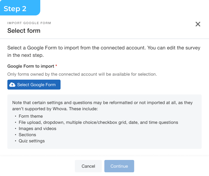 Next, choose which Google Form you would like to import into Whova. Keep in mind that some settings and questions may be reformatted, or not reflected at all, depending on if they are supported by Whova or not.