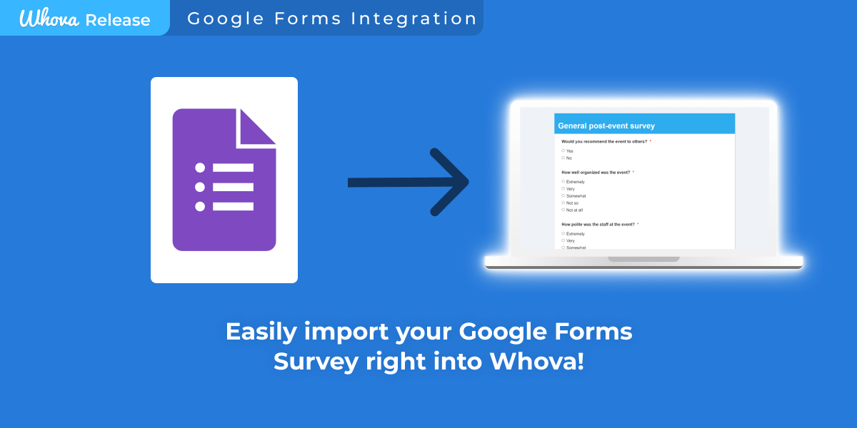 To enhance efficiency for organizers, Whova has introduced a convenient new feature that allows the direct import of past surveys from Google Forms. This development offers a seamless transition, enabling you to leverage the increased response rates characteristic of Whova Surveys without the time-consuming task of manually inputting each question.