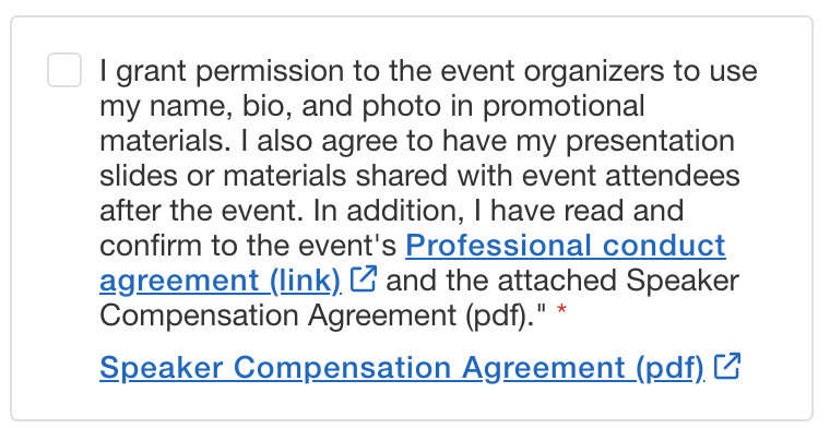 Professional conduct: “I acknowledge and agree to maintain professionalism, respect, and inclusivity throughout the event. I will not use any inflammatory language in my presentation that may promote discrimination, hatred and violence, or behave in ways that may damage the event or hurt its participants.”