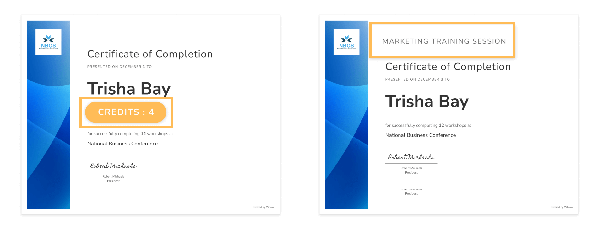 Add customized fields (e.g. Credit Hours, Session Name) to your certificates