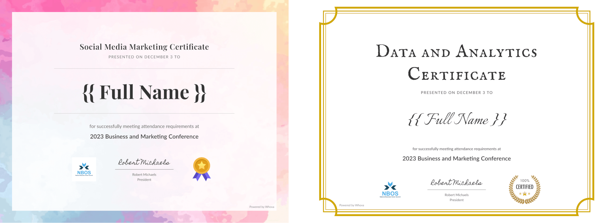 The certificates are easy to customize as much or as little as you like to support many possible uses, and you can use Whova’s session tracking features to easily determine which attendees qualify for which certificates.