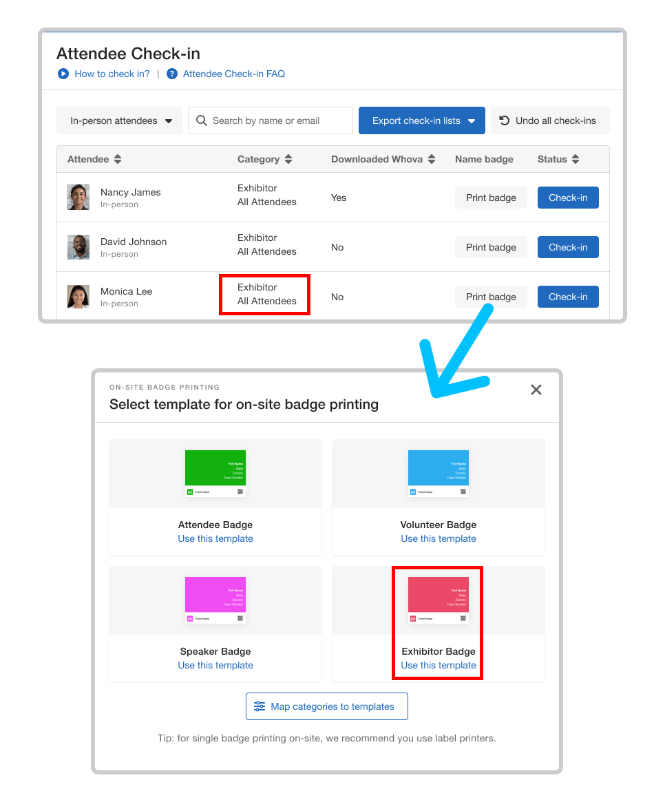 Map your badges to your different attendee categories ahead of time and print onsite with ease!