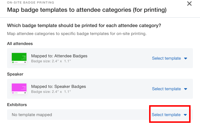 Additionally, it’s extremely easy to map your badge designs to your many different attendee categories ahead of your event. When configuring onsite printing options, just choose the right template for the selected attendee category.