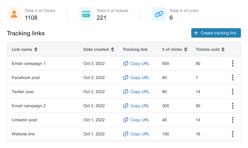 You might be promoting your event across different channels, but how much are they actually helping? To find out, generate a different tracking link for each channel you plan to post to, such as Facebook, Twitter, LinkedIn, or another email list. Easily compare the number of clicks and number of tickets sold from each channel to see which one performs the best.