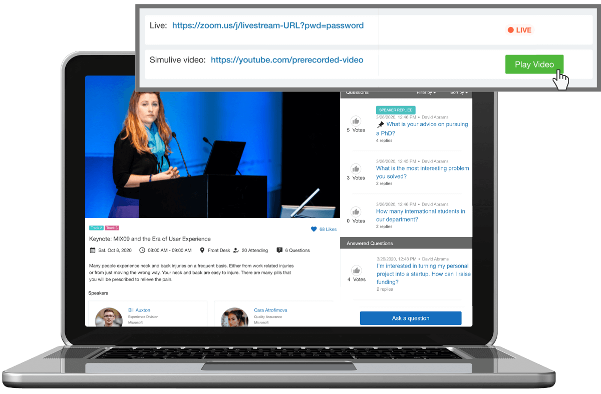 Whova already supports both online session types, but to help out further and allow you to combine the benefits of both, we’re introducing a new way of running sessions: simulive.