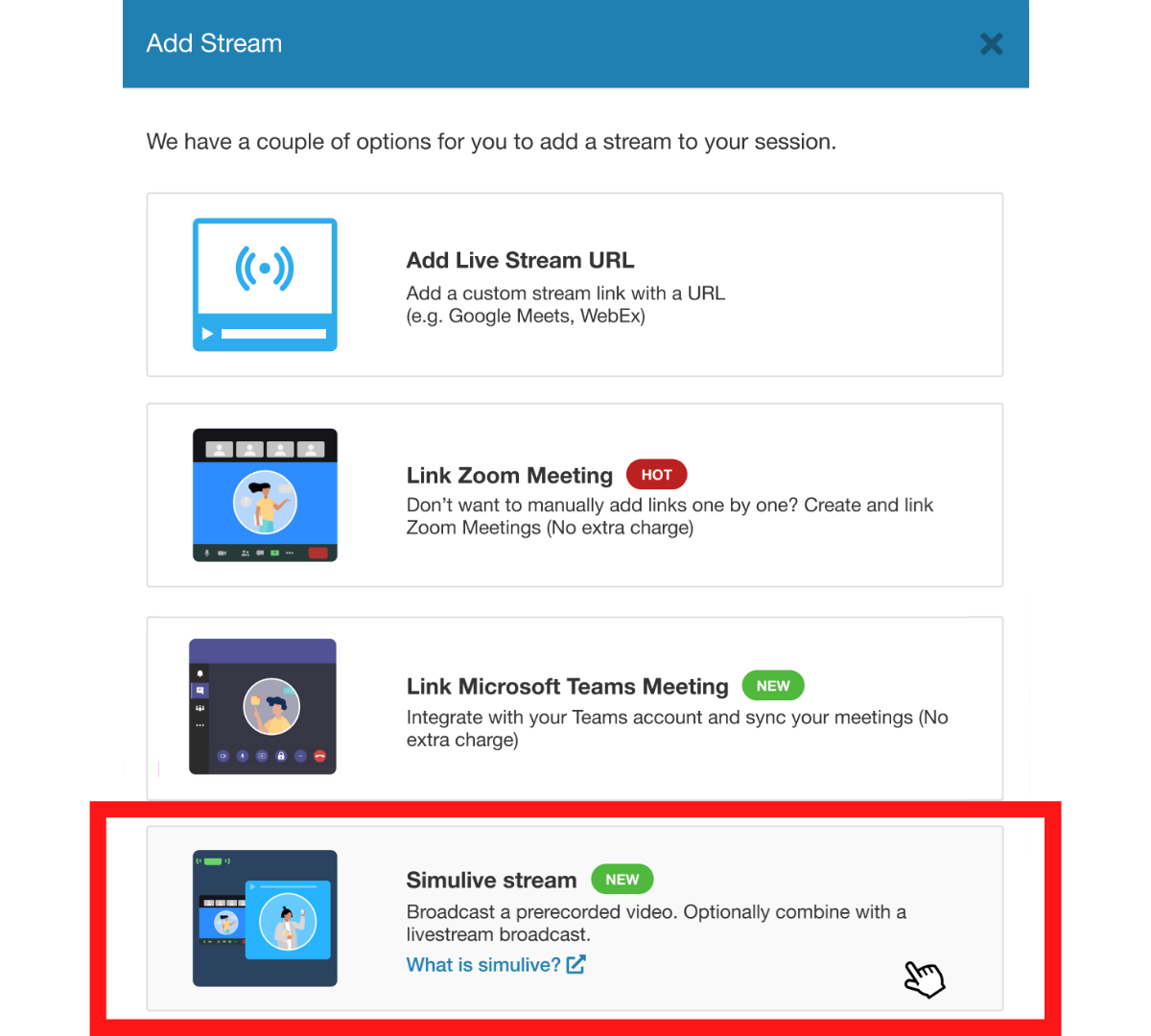 The simulive broadcast can be entirely pre-recorded for your convenience, but if you want to incorporate livestreamed portions for further engagement, it’s easy to do so. Just specify that you want to incorporate livestreamed elements, and you’ll be able to switch between the broadcast and livestream.