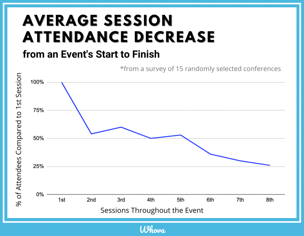 This can be especially true for virtual and hybrid events, which have plenty of advantages, such as increased accessibility, but can also suffer from a low turnout rate. In some cases, less than 50% of registered attendees might actually turn up. And for sessions later on in the event, it can be even worse — we’ve found that, on average, a quarter or fewer of attendees who attended the first session will stay for the final session.