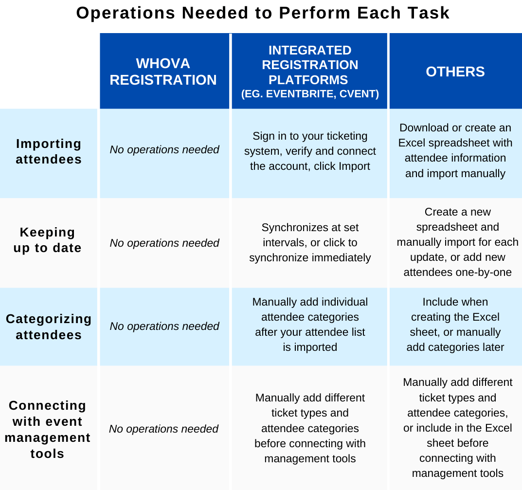 There’s no getting around it: registering attendees through the same platform you use to manage the rest of your event makes a big difference. Using another registration platform requires you to take the time and energy to figure out how the two platforms you’re using connect with one another. You also have to categorize attendees yourself, correct any inconsistencies or differences in how the information transfers between platforms, and take the time to re-synchronize information as more attendees register.
