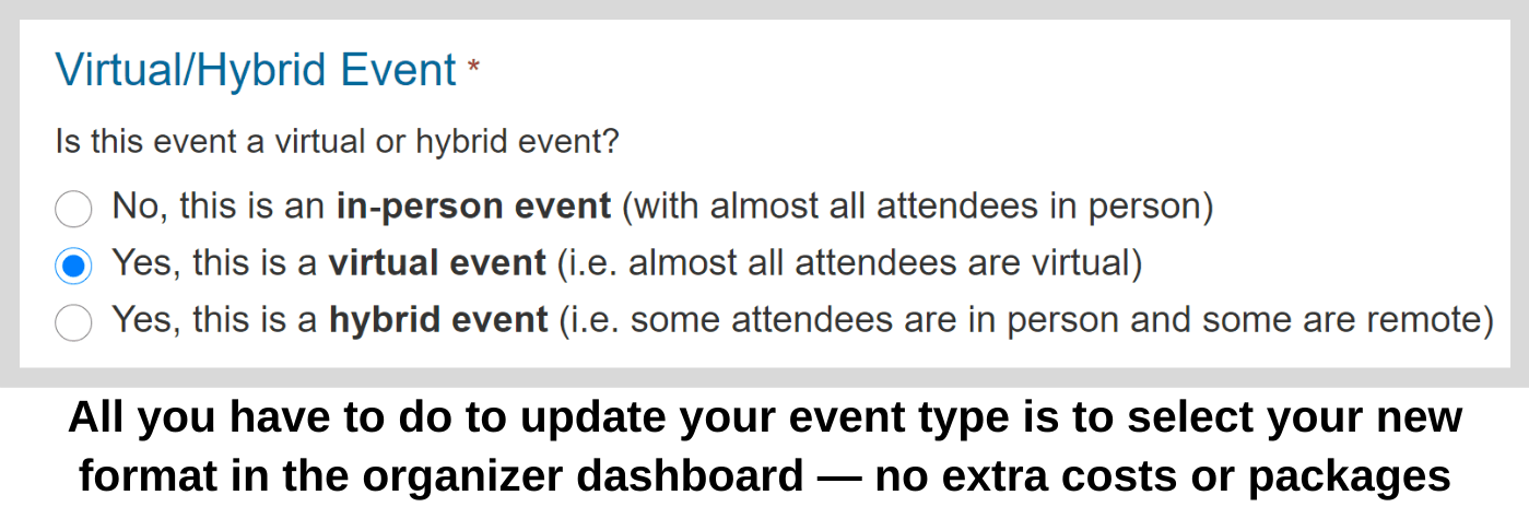 However, if things change, you don’t want to get stuck with your plans on hold. As much as you’re looking forward to an in-person event, you also want to be sure it’s always easy to switch back to virtual! That’s why Whova makes changing your event type as simple as possible.