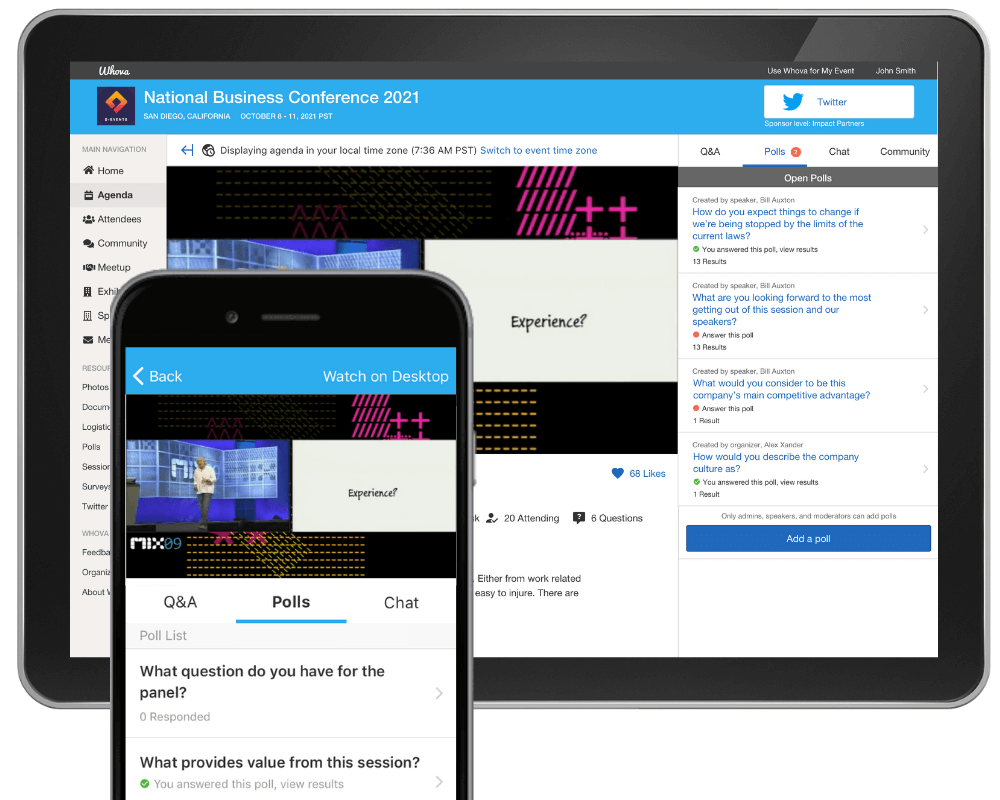 Accessibility is key to engagement, so Whova makes it easier than ever for attendees to share their thoughts through polling from any platform. Session polls are immediately embedded beside the session video, in a sidebar next to the session on desktop and in a tab beneath the video on mobile. Attendees can pull it up while watching on either device, or even fill out the polls on one while watching on the other!