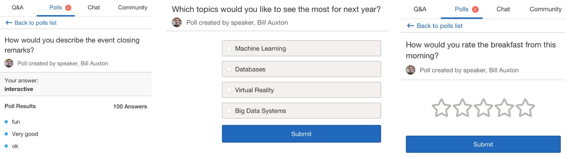 There are a variety of different types of polls that speakers can choose between, such as word clouds, starred ratings, checkboxes, and multiple-choice options. Depending on what the purpose of the individual session will be, these types of polls can be employed in a number of ways.
