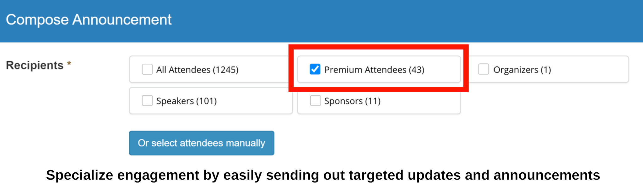Have an exclusive opportunity for high-tier attendees, or just want to remind them of an upcoming limited session? Instead of sending mass notifications that won’t be relevant to all attendees or having to reach out one-by-one, you can specialize how you engage with different attendees. Send out emails or push notifications to dedicated groups, which you can either determine yourself or designate by ticket tier.