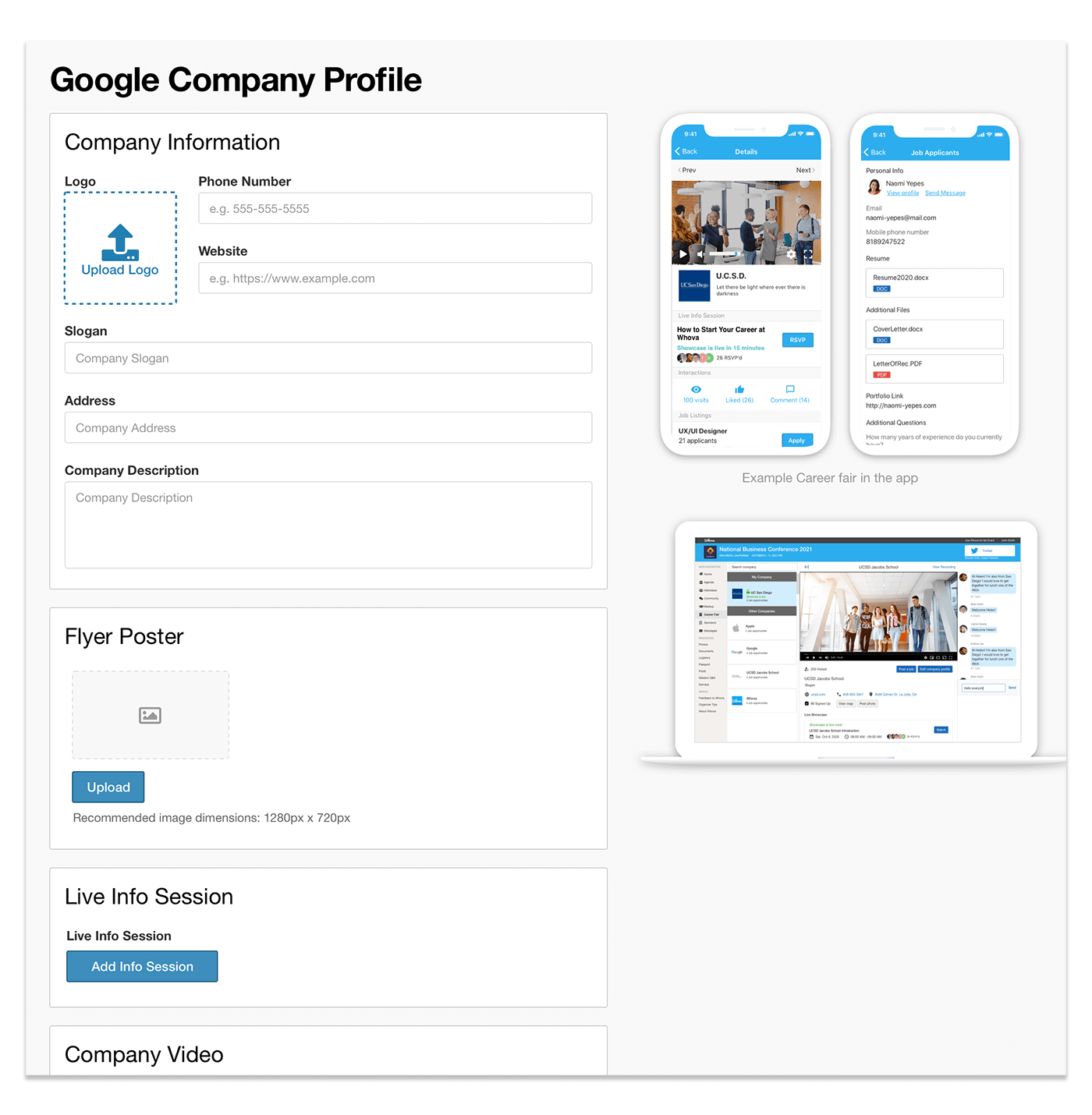 With their own customizable page within the Career Fair function, employers can recreate the experience of exploring different booths online. There, they can feature jobs, any upcoming live showcases, and post relevant photos, as well as uploading documents and flyers, and featuring booth staff for attendees to get in touch with. This will allow all the company information to stay in one accessible, centralized location, so employers can reach the best candidates possible, and attendees can get an overview of a company in a way they couldn’t otherwise.