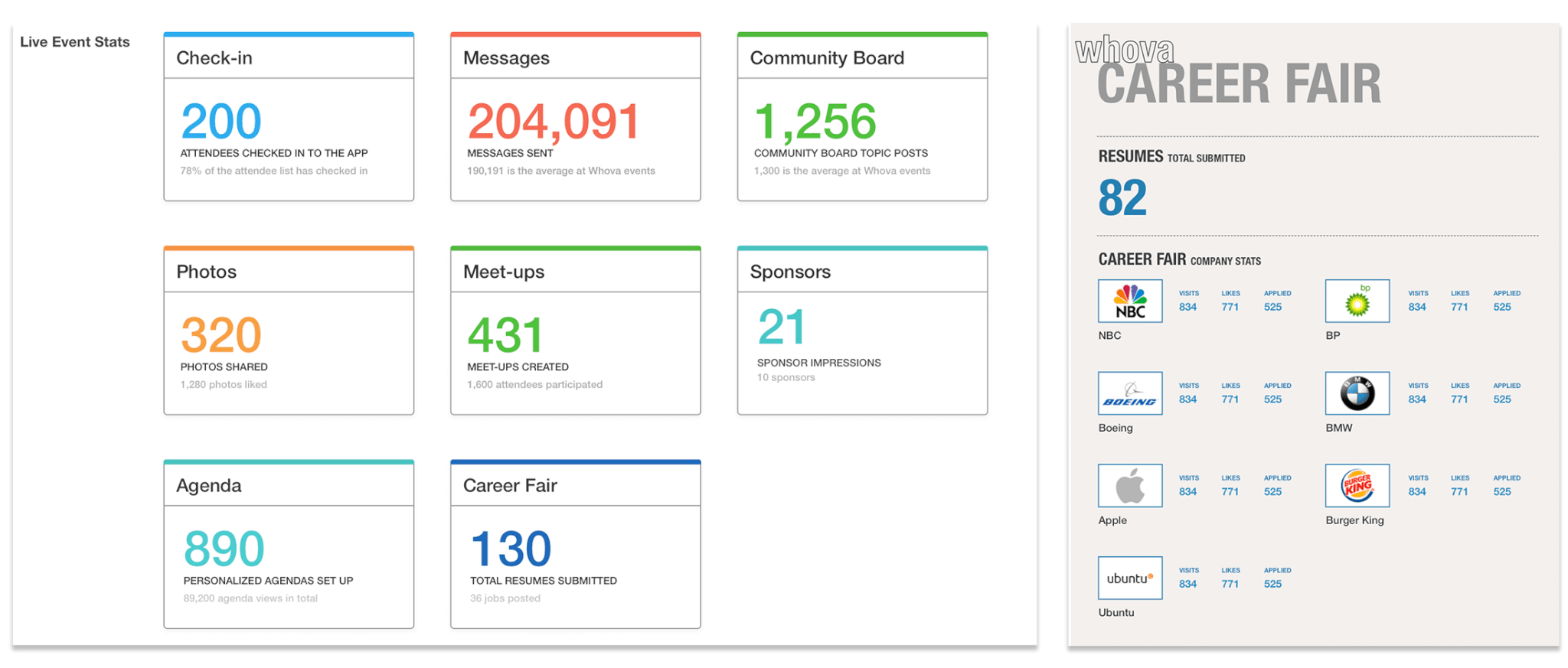 Gauging the success of an event no longer means just checking how big attendance was. Whova’s Career Fair provides live statistics as the event proceeds, telling you all you need to know about traffic interaction and submitted applications. This can allow you to not only check up on the fair while it goes on, but you can also make adjustments and see how it affects engagement in real time!