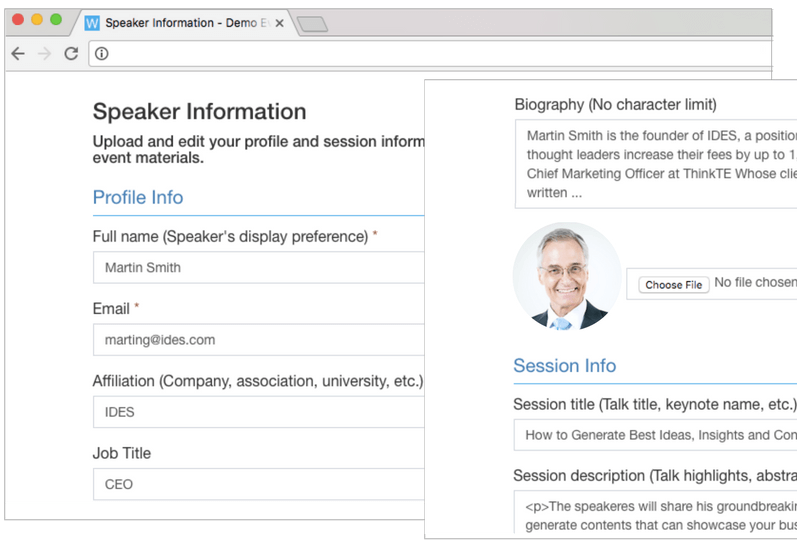- Eliminate tedious back and forth communication with speakers by automating the process to collect their information