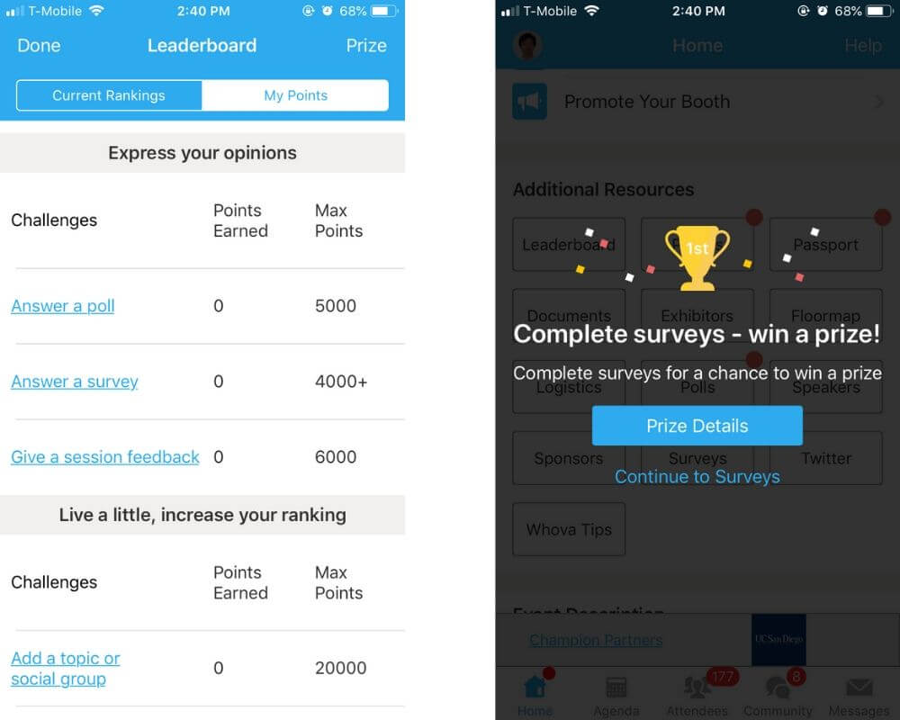 (Right: When an attendee visits a survey, live poll, or session feedback page, the app lets them know that they can earn points and win a prize by completing those.)
