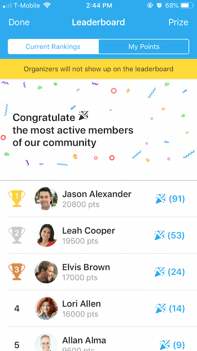 Attendees wanted to get to the top of the Leaderboard so they would complete challenges such as initiating conversational topics in the Community Board, suggesting Meetups, posting a reply to someone else’s topic, joining a meetup, and setting up their profiles. Every time an attendee completed a challenge, it bumped them higher up the Leaderboard. They may receive a prize if your event set it up, and/or enjoy sharing their achievement on social media.