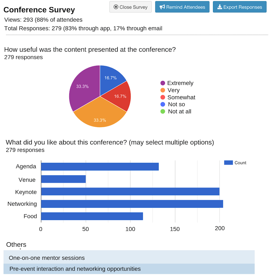 - Without the need for an external survey tool, attendees can complete a survey through the event app that they are already using