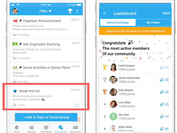 < The Break the Ice in Whova’s Community Board increases attendees’ participation. The Leaderboard gamifies the icebreaking and naturally draws attendees in. >