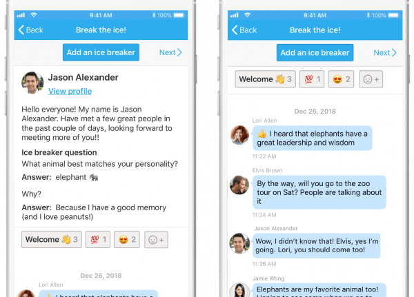 The icebreaker is not just a post for self-introduction. Perhaps another attendee finds that both have the same favorite place to travel, or they both enjoy the same sports. And they can post a reply to talking about it; and other attendees can easily join the conversation at the same time.
