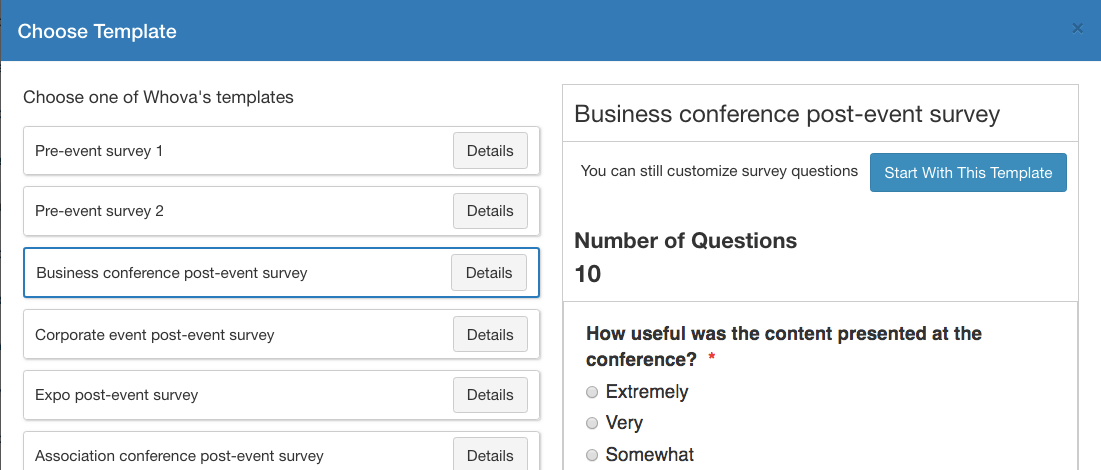 If you’ve already organized similar events with Whova, you can also reuse and edit surveys from your past events. This gets you off to a valuable head start.