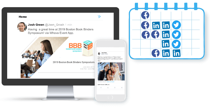 With Whova’s Social Media Scheduler, you can conveniently schedule your own social media posts for multiple places in advance. This helps you promote your event on as many different networks as possible without leaving the Whova dashboard.
