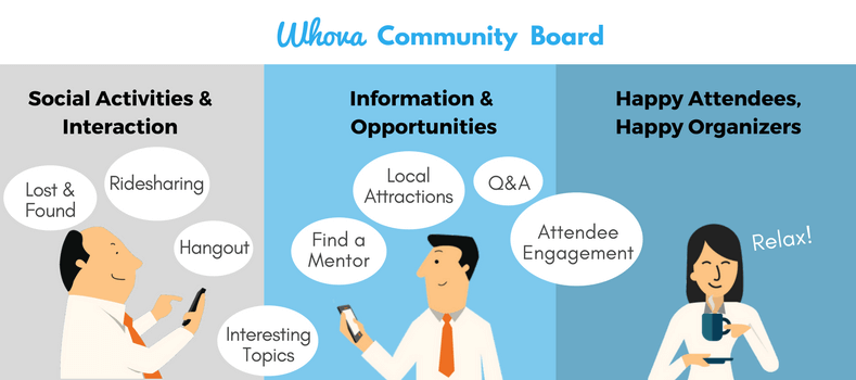 One example is the Community Board, one of Whova’s most-loved features among attendees and organizers. Many events have seen more than 1,500 posts within the Community, where event participants ask organizers questions, plan meet-ups, schedule carpools, create custom discussion topics, share photos of their experience, find lost items, and more.