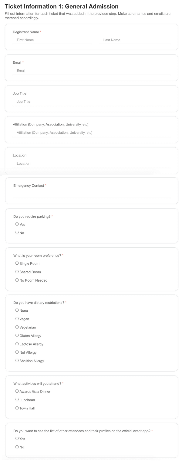 On this page, we will provide the event registration form for general attendees. Here are a few examples of questions from our ready-to-use template: