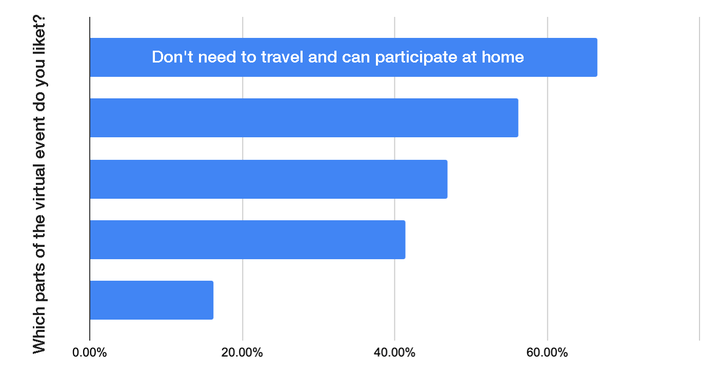 <The factor liked by most virtual event attendee is “Don’t need to travel”>