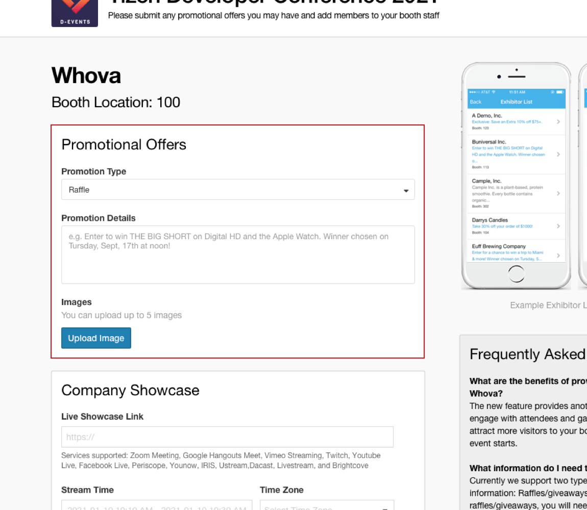 To successfully log in, please sign-in with the email you used when you registered the event as an exhibitor. - You will get multiple sections to fill out including, Promotional Offers, Company Showcase, Company Information, and Primary Contact.