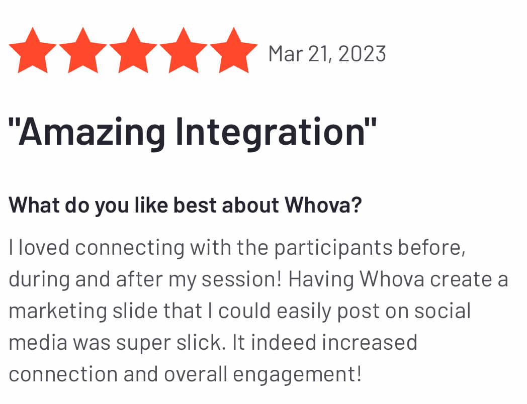 Event app that pulls together streaming, messaging and attendee communication. Ever sat in a video conference and wish you could ask another attendee a question? Whova made it easy, and helped me network after an event which is great! We found a mentor to help our organization with program development – all enabled by the messaging tools on whova.