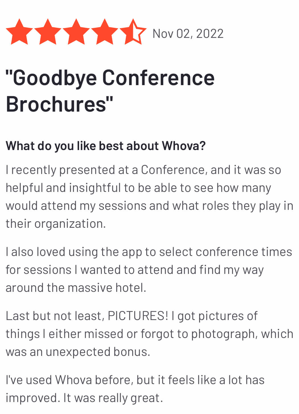 Whova dramatically transformed my experience at the conference and I will always highly recommend it for anyone who attends a conference. I really appreciate that I did not have a giant stack of papers or binder to sift through for every speaker. It could also accommodate for a change in speaker line-up (like what happened at our Emerald Conference). It was extremely valuable for networking.