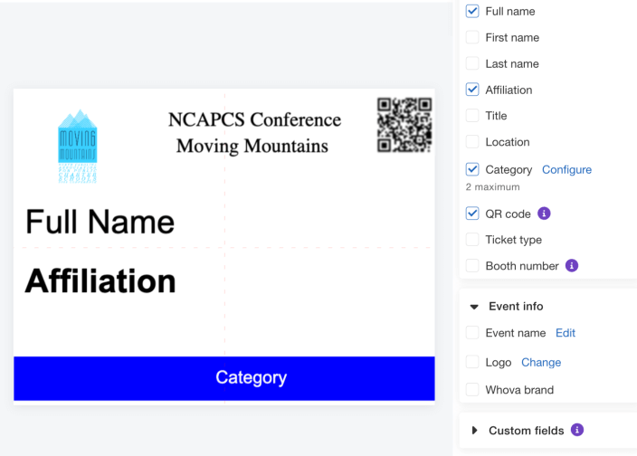 NCAPCS customized their name badge template with all their event information, and then they chose which details Whova would include for each individual’s badge.