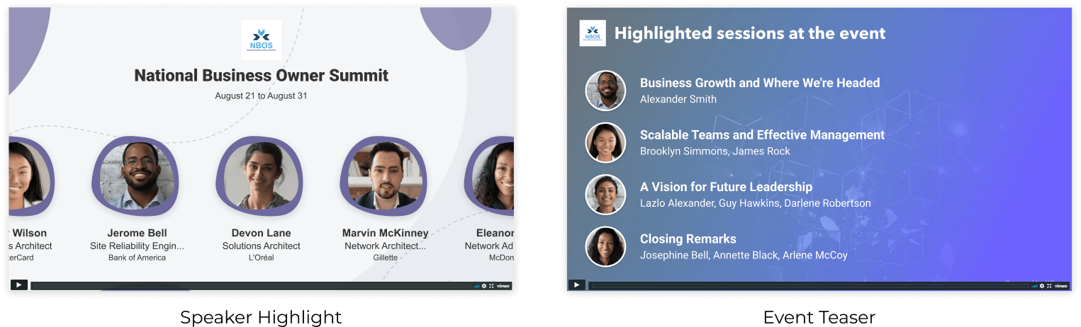 You have two options for what type of video will best show off your event. By highlighting your speakers, you can generate excitement by showing off a few key attractors. Or, you can feature an overall event teaser, giving attendees an idea of the whole event and allowing you to promote certain sessions and sponsors from the very beginning.