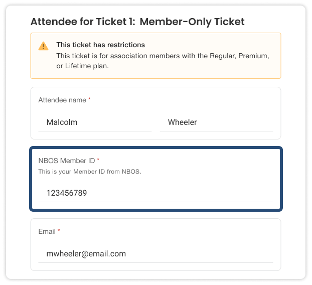 On your event registration page, if a member-only ticket is selected, users will be asked to enter their member ID before purchase. Then, Whova will automatically verify their member ID and email with your WildApricot database. Only verified registrants can proceed to purchase this ticket.