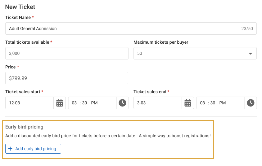 Doing so will allow you to fill out basic details; simply enter the early bird ticket price and the ending times/dates when attendees can still purchase this ticket. You can also add the number of available tickets, ensuring that you only sell early bird tickets to as many attendees as you’d like.