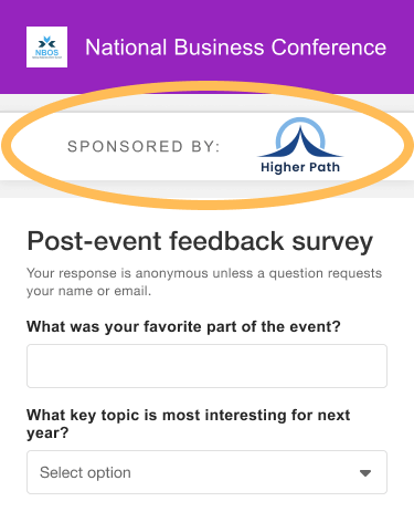 (3) Surveys: Whova’s survey feature is another place heavily frequented by attendees, and now, it’s a great way to promote your sponsors too! Similar to the web app landing page, you are now able to showcase multiple sponsors in the survey page viewed by your attendees, giving even more visibility for sponsors.