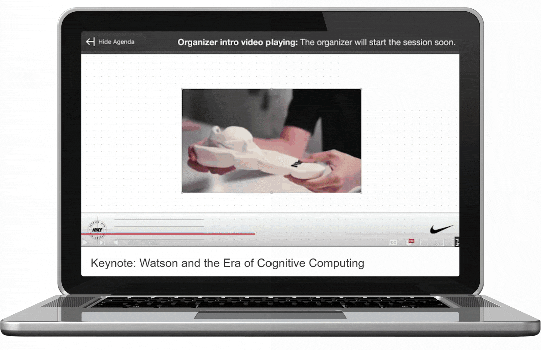 Before the session starts, attendees can view an intro video chosen or uploaded by you, allowing you to further visibility for different aspects of your event, such as promoting sponsors and exhibitors. All you have to do is attach their company video, or even record your own thanking them for their support!