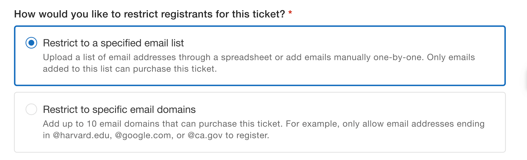 If you’re pulling from a more flexible pool of possible attendees, such as alumni of a specific school or employees of a company, you can instead limit tickets to a specific email domain (or what comes after the “@” in your email address). You can even whitelist up to 10 different domains for your event, so only attendees with emails under those domains can register. This is a great way to handle ticketing for student events and internal company events, where attendees have the same email domain, so you don’t have to upload each pre-approved email address.