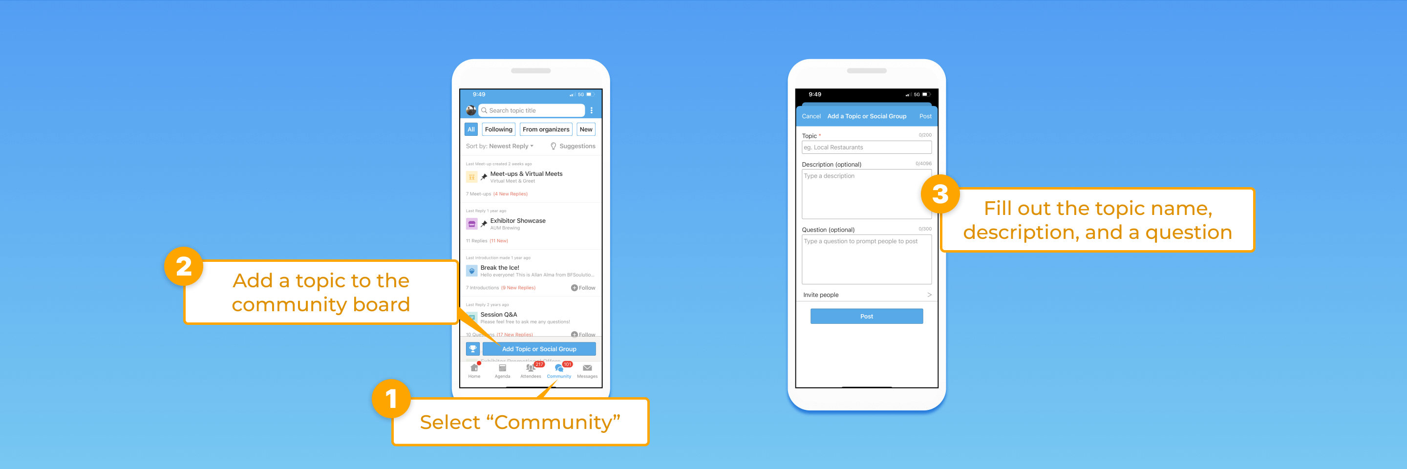 - Click on the Community Board on the bottom of the mobile app.