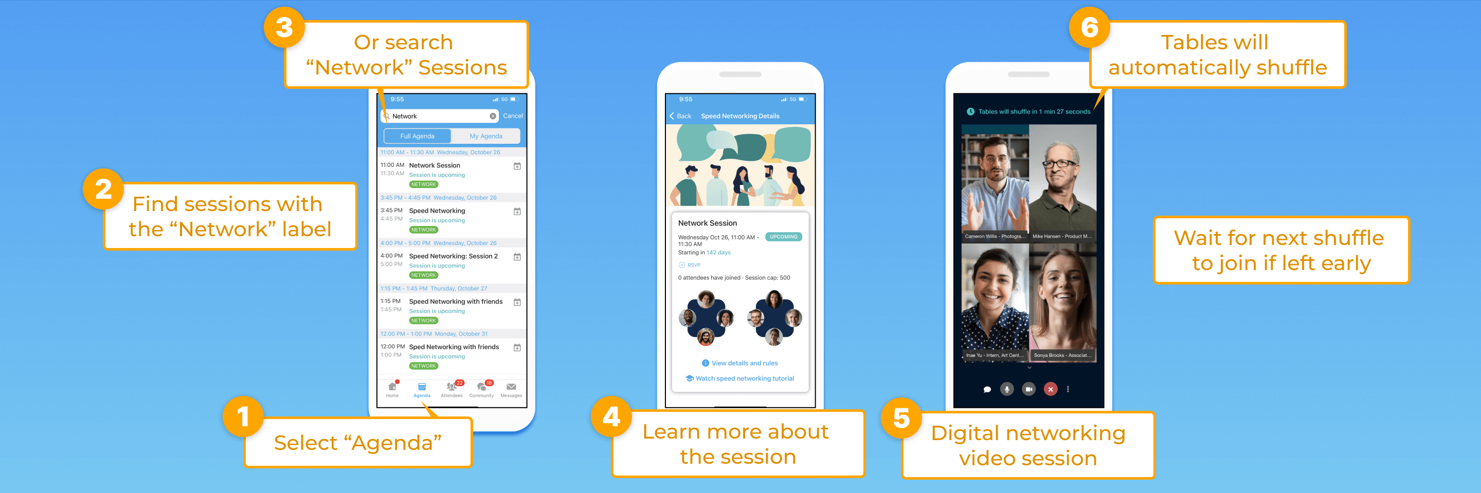 - Or find all speed networking sessions under the agenda in a section titled “speed network”.