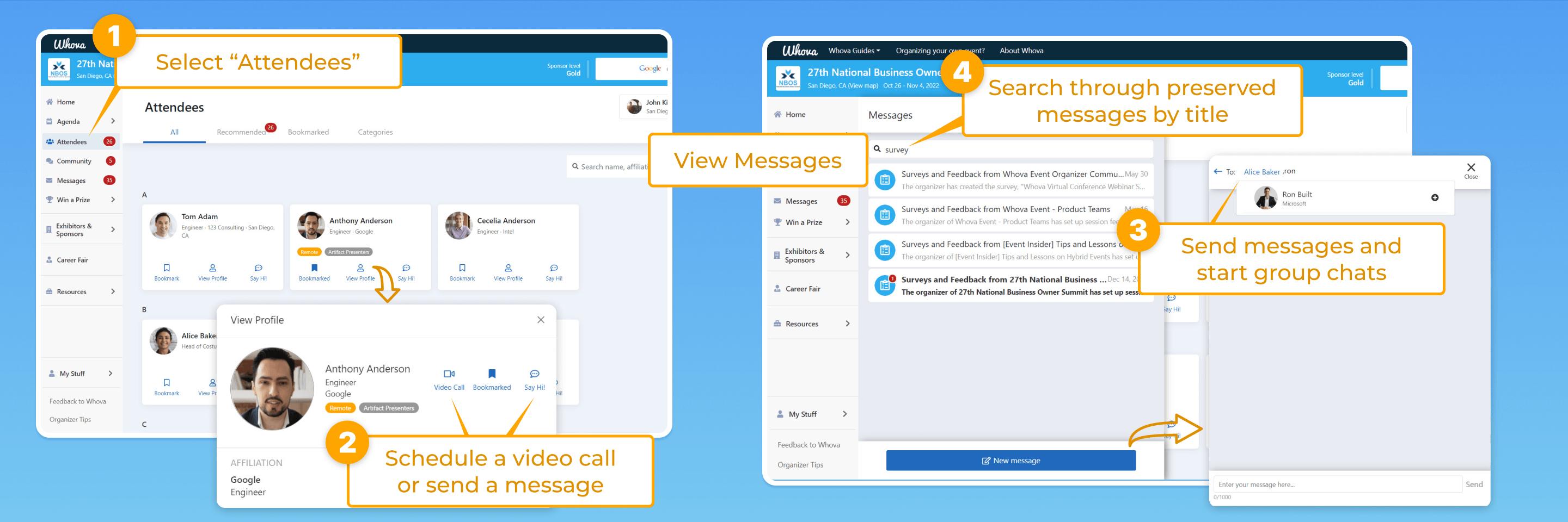 - Send direct messages from the messages tab on the left of the dashboard, or add multiple attendees to start a group chat.