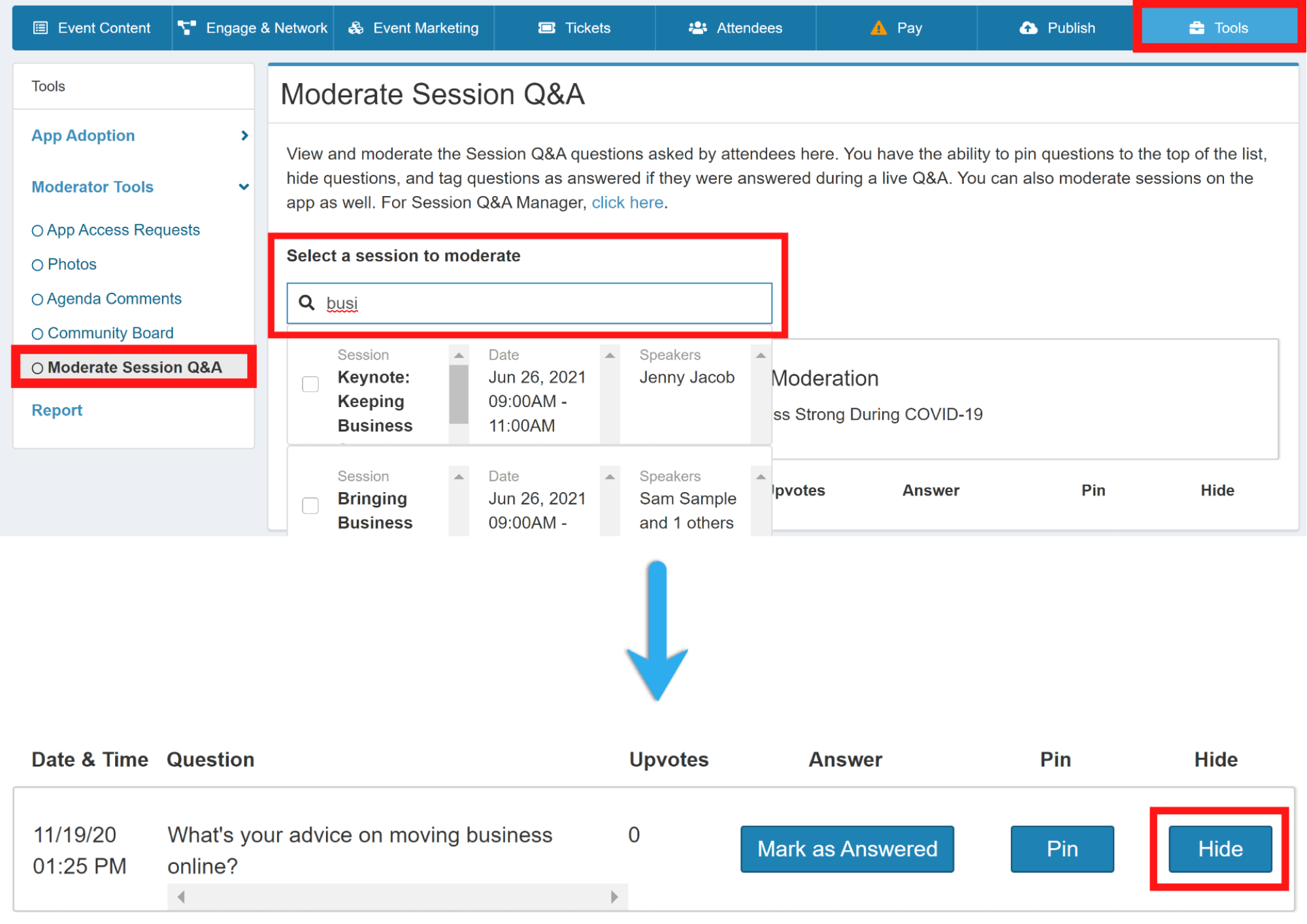 - On the left-hand sidebar, choose Moderator Tools, and then Moderate Session Q&A.