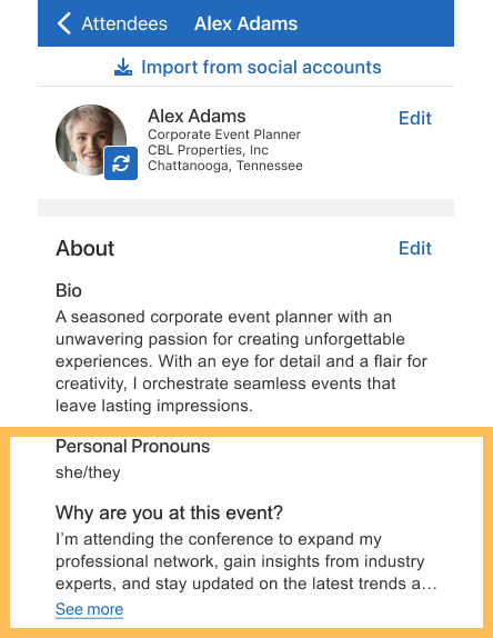 Every event is different, which means there’s no limit to what information your attendees may want to display in their profile. For instance, at many events, attendees may want to display general identifying information that goes beyond the basics, such as: