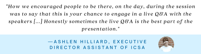 One event, the ICSA Conference, used this strategy to great success by sending out announcements heavily emphasizing that this would be attendees’ opportunity to engage with the event’s speakers. Even though many of their sessions were pre-recorded, they were still able to give attendees an exclusive opportunity for interaction by having the speaker be active in the session’s chat as the session aired and join the session for a live video Q&A after the pre-recorded session finished streaming.