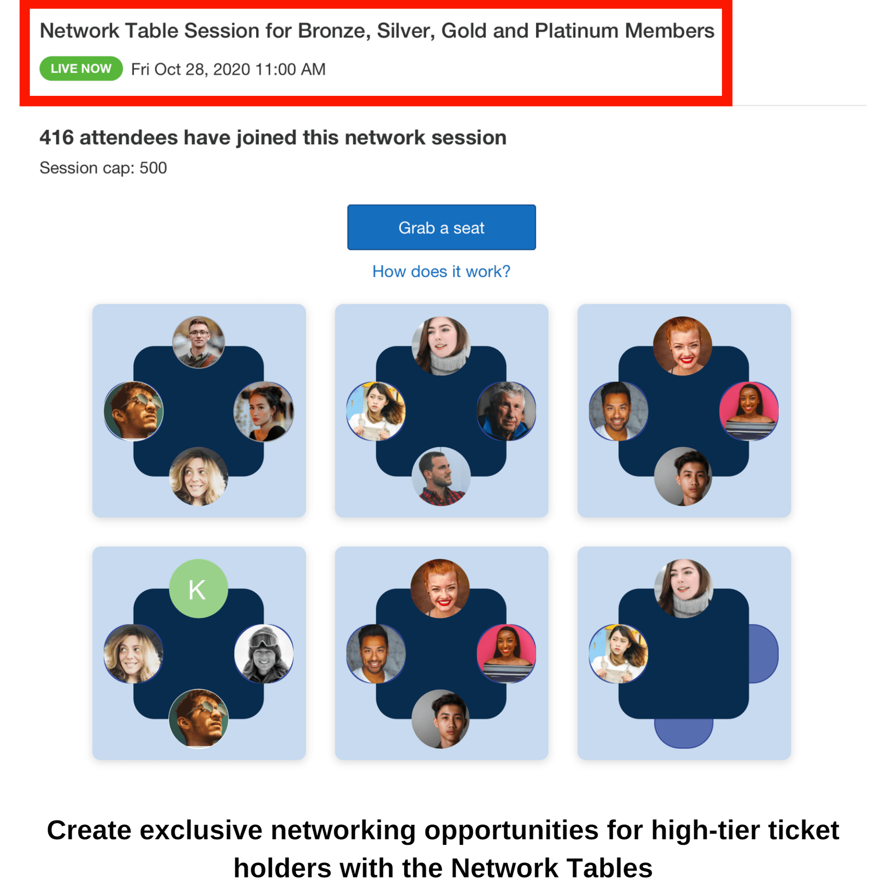 Network Tables allow attendees to chat with others and make new connections through a group video call. While organizers can open these sessions to all attendees, they can also create exclusive, invitation-only sessions or choose to make Network Tables only available to certain ticket tiers to provide the same benefits of privately chatting with other VIP attendees.